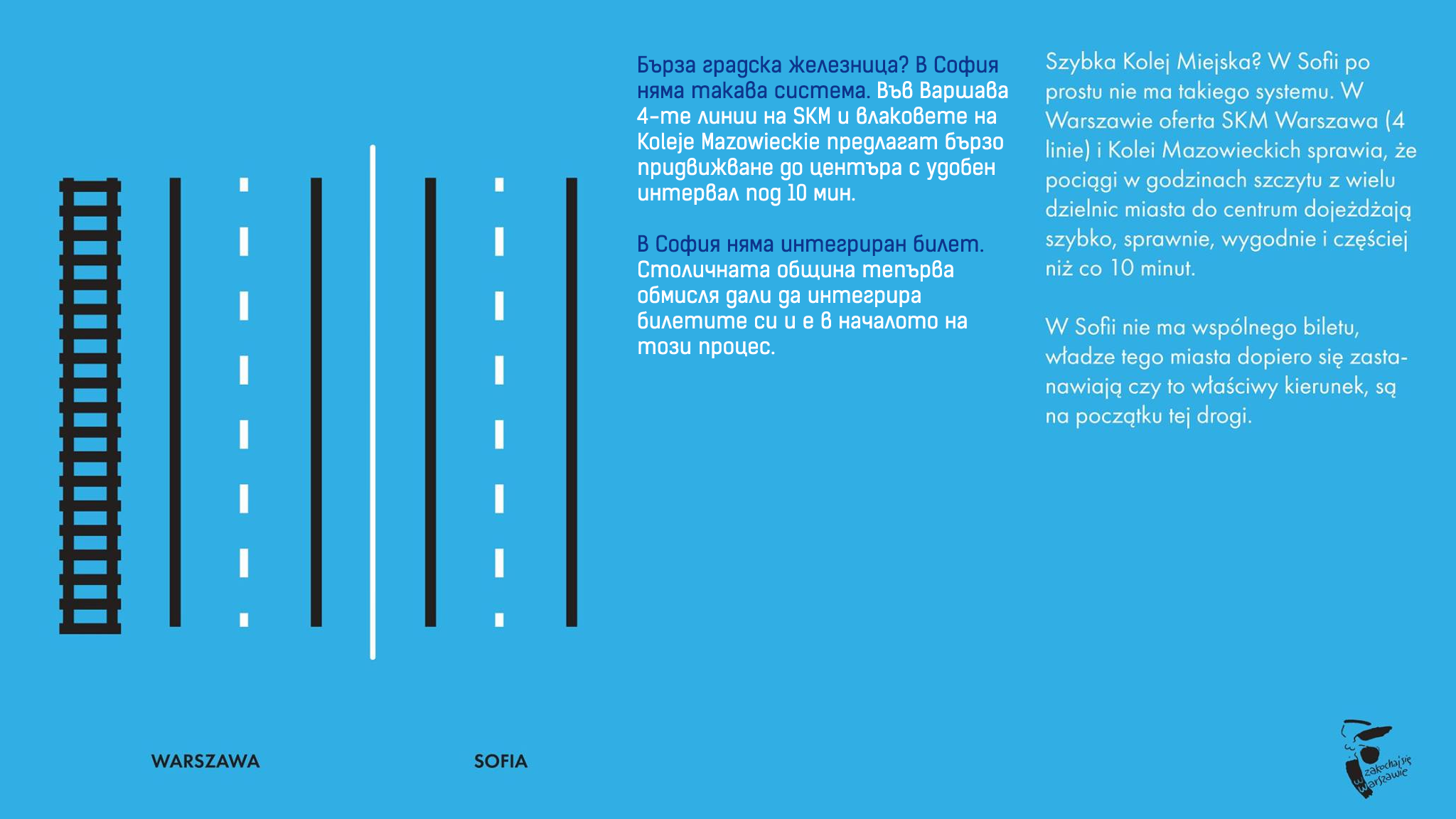 “Бърза градска железница? В София просто няма такава система” - това също е сред направените обективни коментари от официалните представители на община Варшава. За разлика от тук, в полската столица функционира система от 4 линии на градска железница с интервал на движение от 10 мин. в час пик.