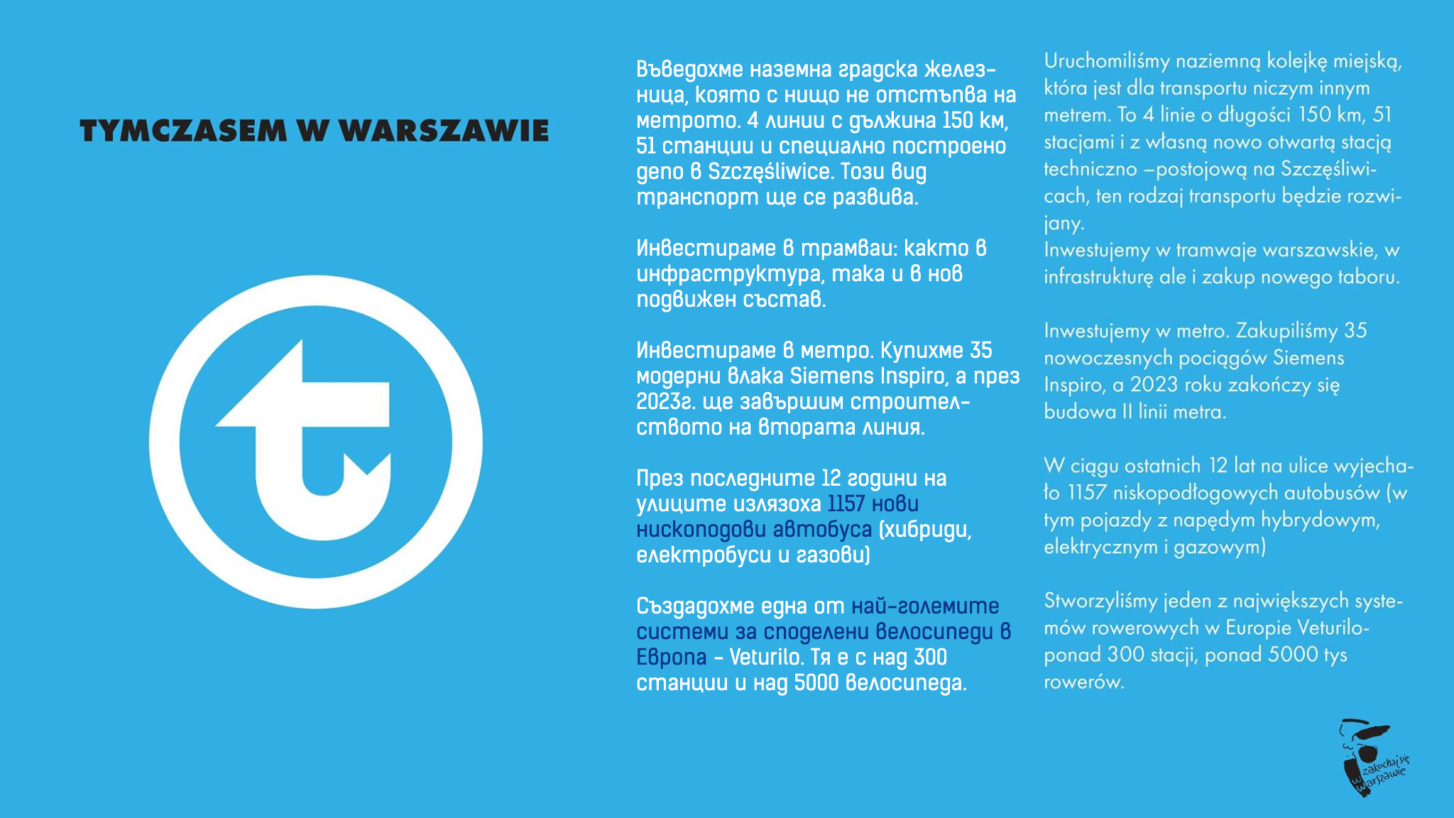 За финал се обръщаме към г-н Яки, който тези дни е и на посещение в София – г-н Яки, днес сте в София, за да хвалите транспортната ѝ политика. Преди да го направите, разходете се из нея, повозете се на наземния ѝ транспорт и преценете сам – искате ли такова бъдеще и за Варшава?