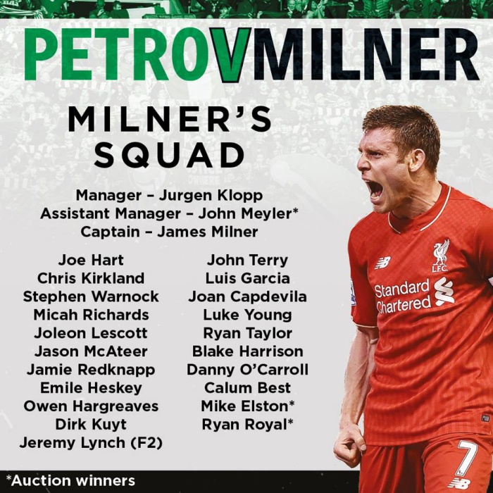 Точни за състава на Милнър бяха Джеръми Линч и Капдевиля (2). В отборите и на скамейките места заслужиха и ентусиасти, които дадоха най-много пари в благотворителния търг преди срещата.