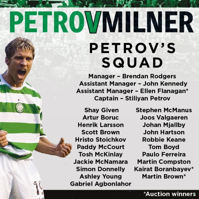 Партньор на Стенли за добрата кауза беше английският национал Джеймс Милнър от "Ливърпул". Двамата бяха капитани на тимовете си. Селекцията на Петров игра с клубните цветове на "Селтик" и в нея личаха Христо Стоичков, шведът Хенрик Ларсон, друг национал на "Трите лъва" - Ашли Йънг, с когото Стан игра в "Астън Вила", Роби Кийн и един куп знаменитости на "детелините".