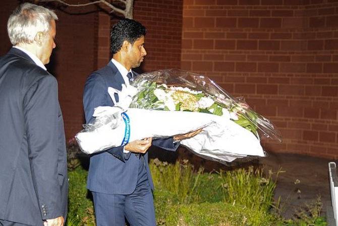 Президентът и собственик на ПСЖ Насер ал Хелайфи поднесе букет цветя на мемориала в памет на загиналите 96-има запалянковци на стадион "Хилзбъро" в Шефилд на полуфинала за Купата на футболната асоциация между "Ливърпул" и "Нотингам Форест" на 15 април 1989 г.