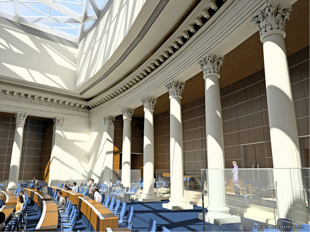 Стъклен покрив, тъмносин мокет на пода, мрамор по стените, банки с дъбов фурнир. И вече със зона и за патриарха. Така ще изглежда новата пленарна зала за българските парламентаристи, чието строителство се очаква да приключи до средата на 2019 г. В действителност става въпрос за преустройство на бившия Партиен дом, който е със стоманено-бетонна плоча отгоре. Сега там се провеждат заседанията на почти всички парламентарни комисии.