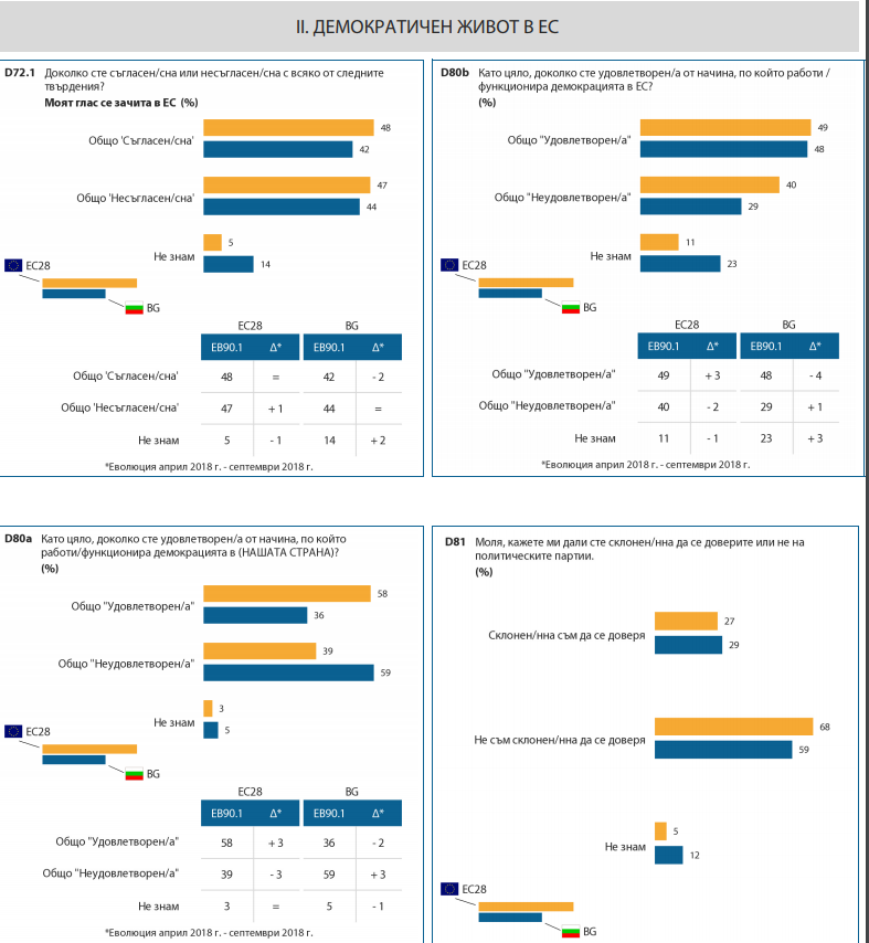 48 на сто в Европа процента смятат, че гласът им в ЕС се зачита. Това настроение, изглежда, намалява в редица страни като България например, където този процент е 42.