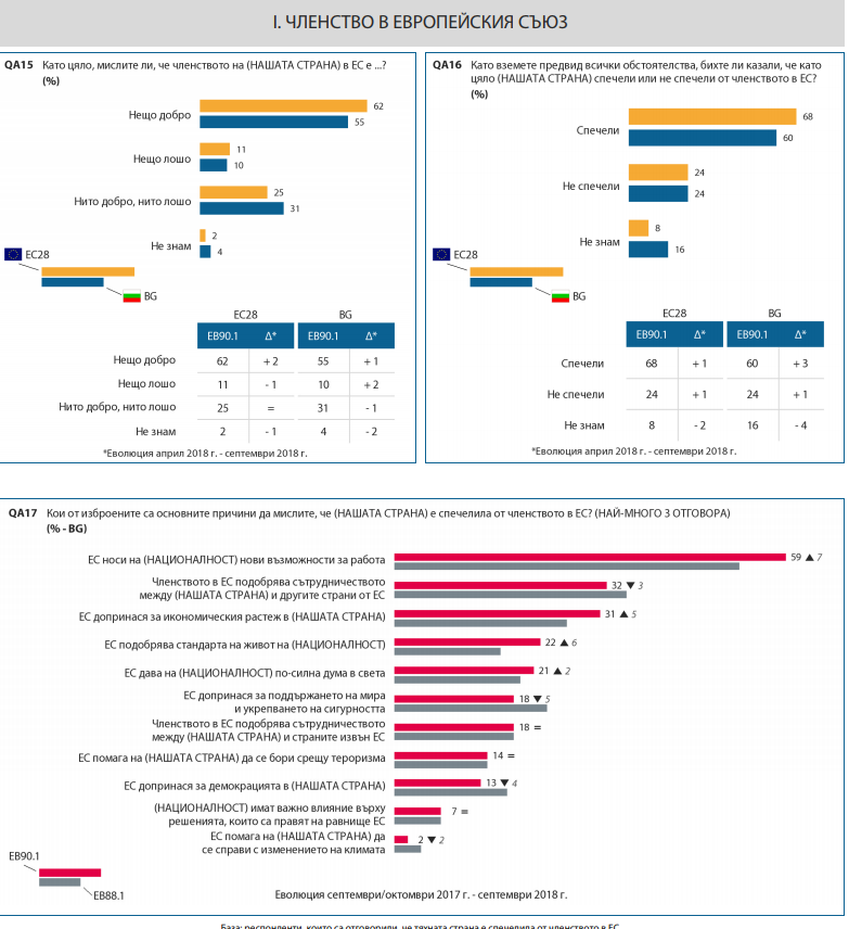 55 на сто от анкетираните у нас смятат, че еврочленството на страната ни е нещо добро. Същевременно процентът на българите, според които сме спечелили от членството в Европейския съюз, е 60.