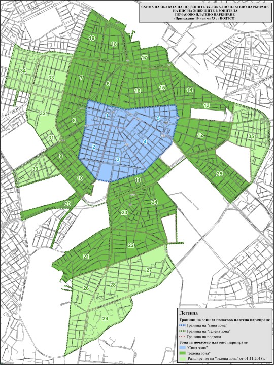 „Синя зона" - оградена от булевардите - "Христо Ботев", бул. "Тодор Александров", бул. "Княз Ал. Дондуков", бул. "Васил Левски", бул. "Ген. М. Д. Скобелев". По граничните булеварди посочващи обхвата на зоната, действа режим на почасово платено паркиране "Синя зона".