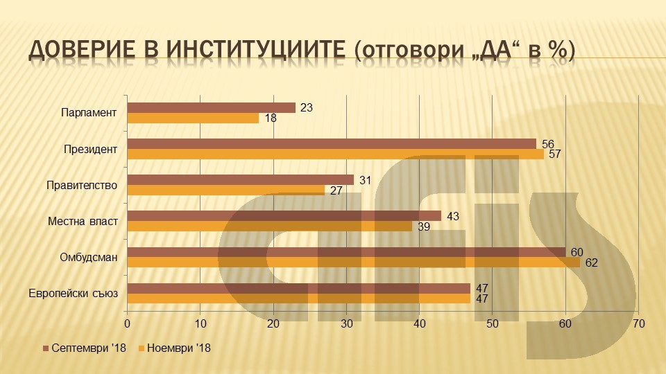 18% възлагат доверие на Народното събрание, което бележи спад с 5% спрямо септември; 27% се доверяват на правителството, резултат с 4% по-нисък от предния месец. Институциите на съответните местни власти традиционно се радват на по-голямо доверие от централната, но и при тях се забелязва спад от 43 до 39%. (Той е обясним с подранилата подготовка за местните избори през есента на 2019 г.).