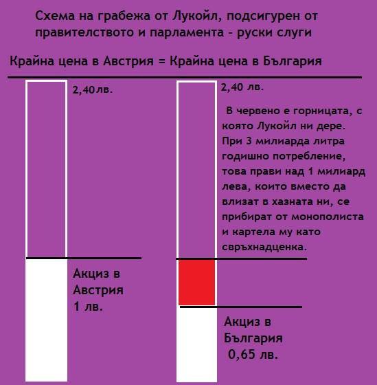 Защо е така? Според таблица, публикувана от юриста Георги Георгиев в социалната мрежа Facebook, държавата очевидно прави услуга на руската компания "Лукойл", като "умишлено държи най-ниския позволен акциз в ЕС - само 65 ст. на литър, и така монополистът "Лукойл" си слага огромна надценка.