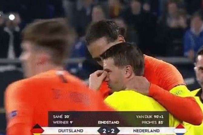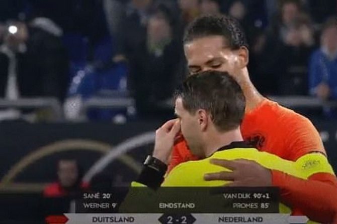 Но и това се случи и то не след "обикновен" двубой, а след решителния за Холандия сблъсък с Германия (2:2) в Лигата на нациите в Гелзенкирхен. След последния съдийски сигнал от прякото тв предаване се видя как капитанът на "лалетата" Върджил ван Дайк отива при рефера Овидиу Хатеган от Румъния, прегръща го и прошепва нещо. Арбитърът плаче.