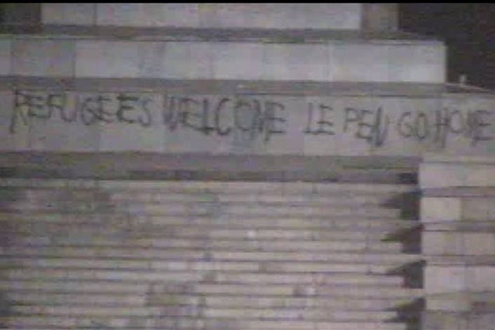 Днес съдът постанови, че съдържанието на надписа "Добре дошли, бежанци. Льо Пен, върви си вкъщи" не е цинично и грубо и няма основание за арест на Димитров. Заради липсата на опасност от извършване на друго престъпление и от укриване съдът постанови мярка "подписка".