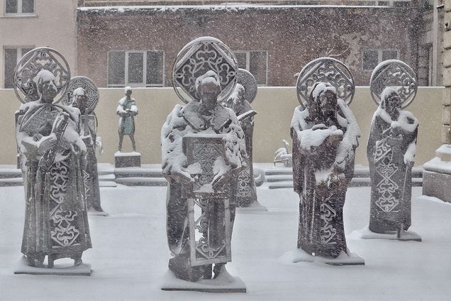 Те са безтелесни, имат само лица, ръце, покрити с блестяща орнаментика нимбове и ажурни наметала. Изработени са от патиниран с различни способи алуминий. Дъждът допълваше лицата с интересни ефекти, но на следващия ден снегът скриваше чертите им, а точно в събота изложбата имаше доста повече посетители.