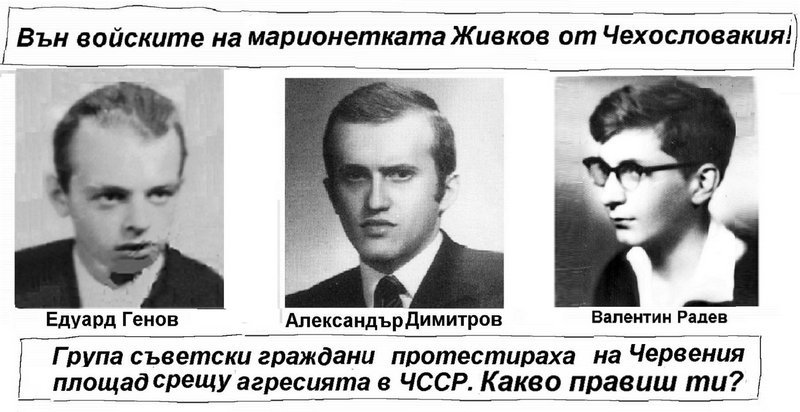 И се допълва, че тримата студенти от Софийския университет са разпространявали позиви в София и Пловдив, с които осъждат агресията на армиите на Варшавския договор и българското участие в нея. След донос тримата са арестувани и задържани от ДС и под натиск на властите са изключени от университета.