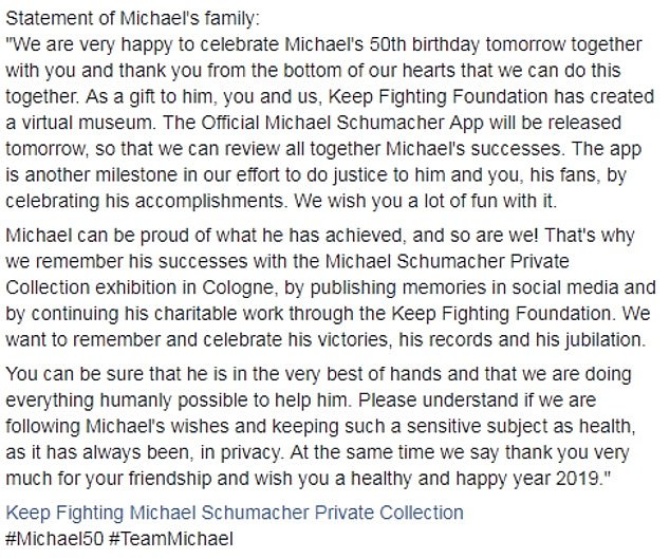 "Много сме щастливи да празнуваме утре 50-ият рожден ден на Михаел заедно с вас. Дълбоко от нашите сърца ви благодарим, че празнуваме заедно", така започва съобщението.