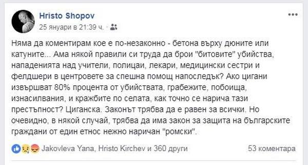 Тези дни театралната звезда Христо Шопов влиза в новините с опит за гражданска неартистична изява. Актьорът, изиграл в „Страстите Христови“ Пилат, който отказва да съди Божия син, осъжда страстно „циганската престъпност“ в България в статус, който започва с „няма да коментирам кое е по-незаконно – бетона върху дюните или катуните…“ и завършва с „но очевидно, в някой случай, трябва да има закон за защита на българските граждани от един етнос нежно наричан „ромски“ (запазваме автентичния изказ на актьора – бел. авт.).
