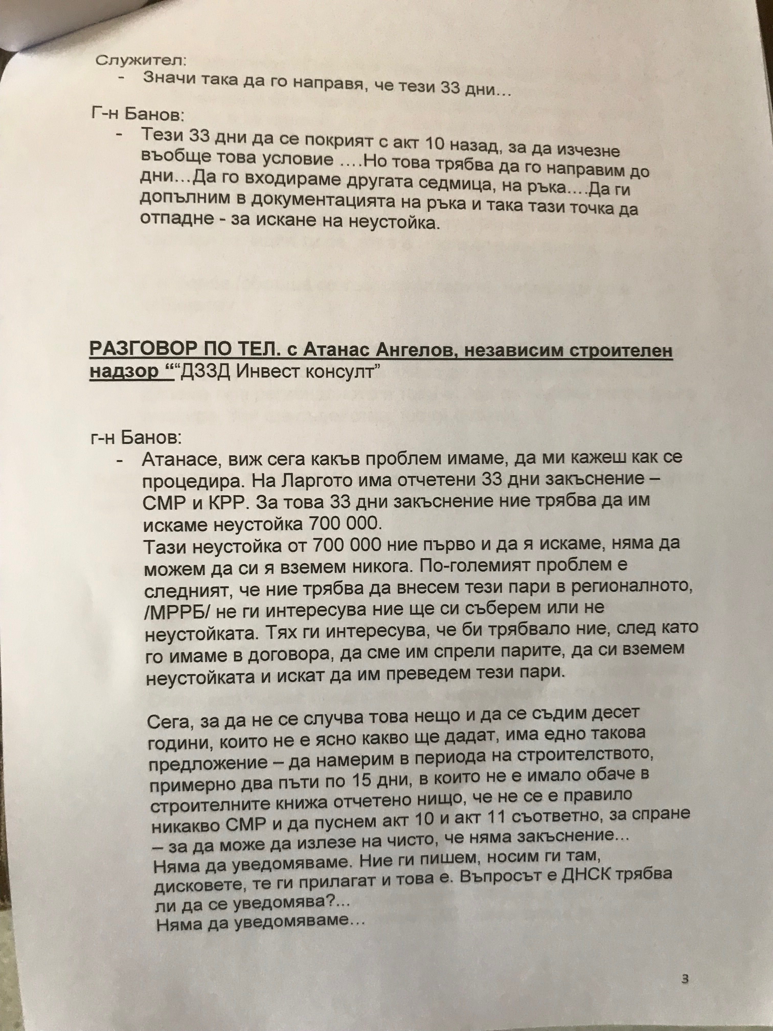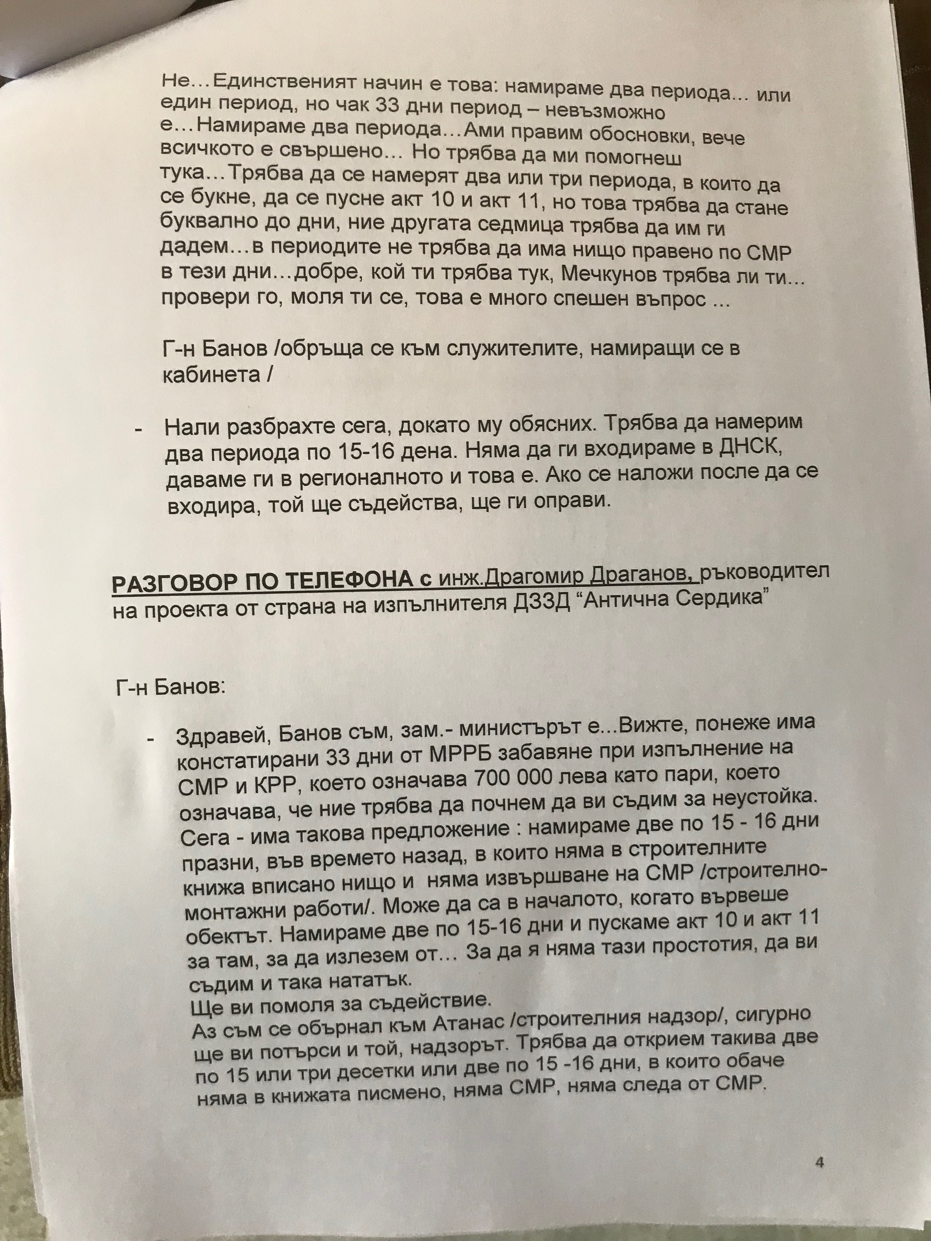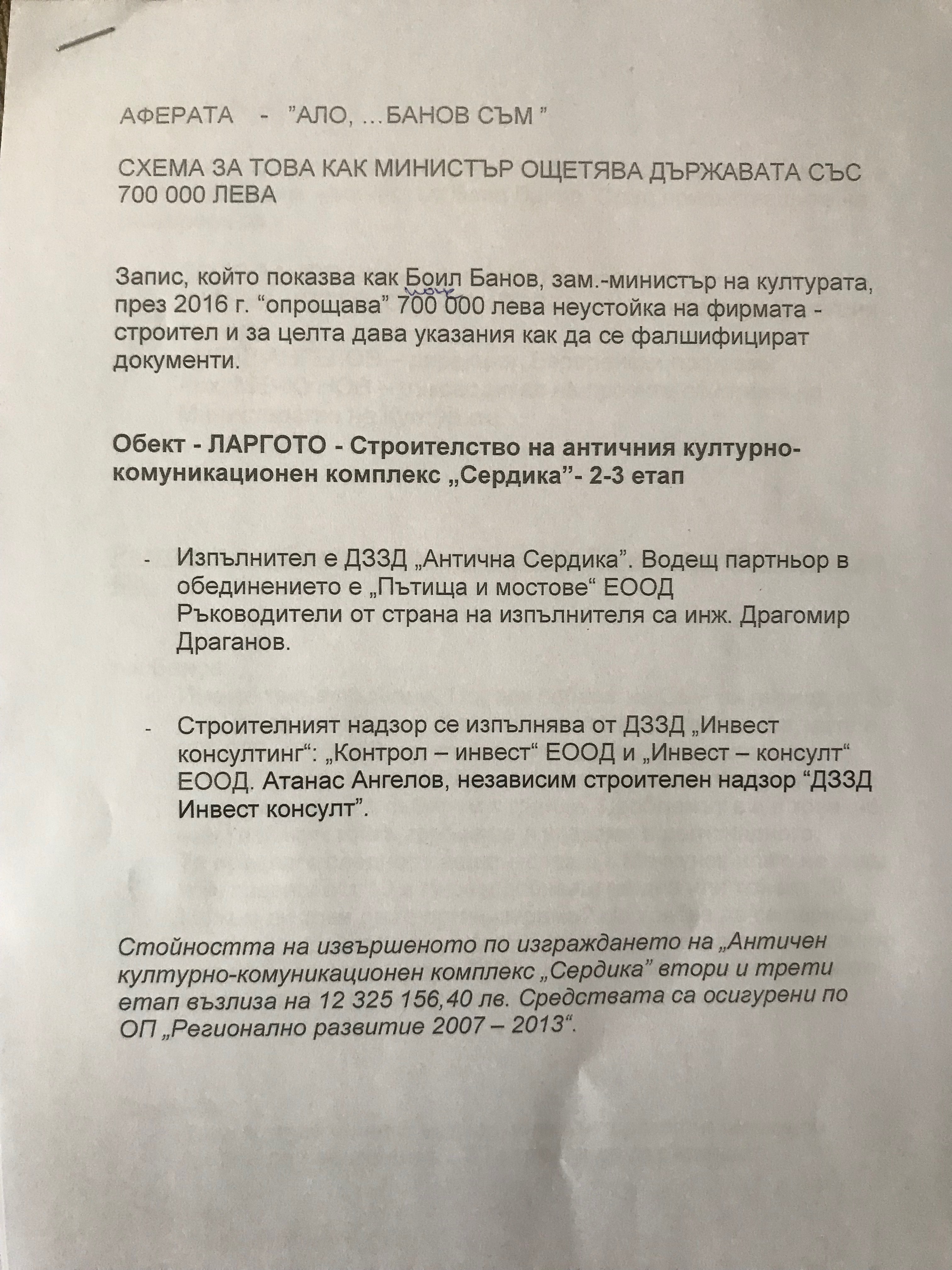 Текстът на аудиозаписите с участието на министъра на културата Боил Банов от времето, когато е зам.-министър, бе разпространен от БСП и на хартиен носител. Става дума за уреждане на документи с цел избягване на неустойка за изпълнителя на ремонта на "Ларгото" в центъра на София пред Министерския съвет. Говори се за сума от около 700 000 лв за забавяне на проекта. Цялата му стойност е 12,3 млн. лв.