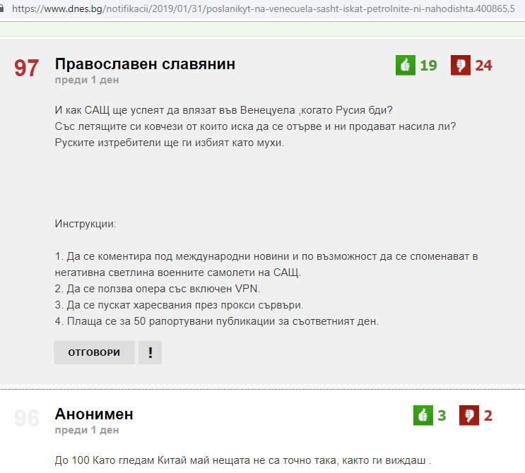 1. Да се коментира под международни новини и по възможност да се споменават в негативна светлина военните самолети на САЩ.