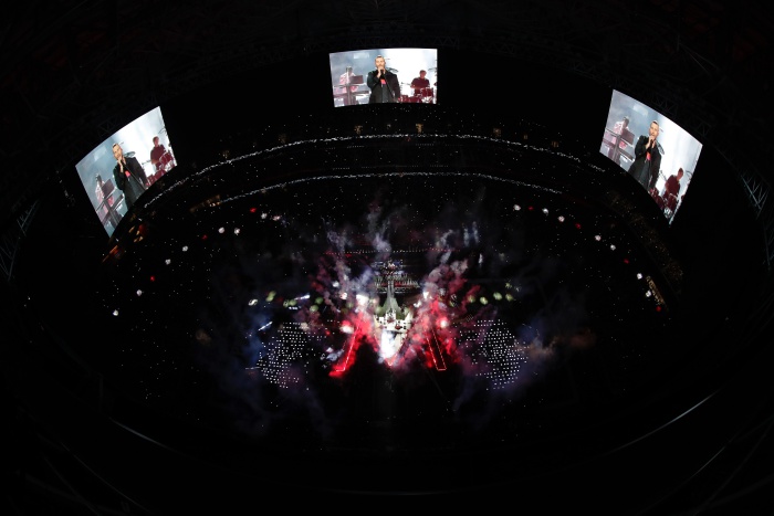 На полувремето страхатно шоу, подкрепено от светлинни ефекти и заря, изнесоха групата Marron 5 и рапърите Биг Бой и Травис Скот. Химнът преди срещата изпя Гладис Найт.