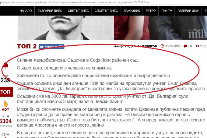 Първата инстанция вече присъди на Джасим 3000 лева - обезщетение за неимуществени вреди, "изразяващи се в уронване на личния и професионален авторитет на ищеца, нанесен психологически и физически дискомфорт, претърпени вследствие на клеветническа информация, съдържаща се в статия, публикувана на 3.03.2017 г. в електронното издание на „П. Н." ЕООД на сайта www.pik.bg със заглавие "СКАНДАЛ И ГАВРА! Историк и учител от „Да, България" хули българщината навръх 3-ти март, нарича *******" (бел. ред. - последното със звездичките в съдебното решение всъщност е "Левски л*йно", но е... заличено автоматично, защото съдържа име - заради спазването на личните данни).