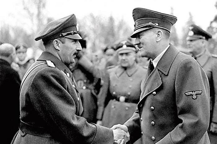 До тях са цар Борис III и Адолф Хитлер в дружеско ръкостискане, при една от честите им срещи.