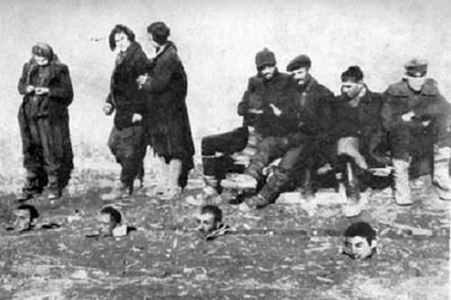И на последната, отново черно-бяла, е ясното доказателство за това докъде нацизмът доведе България - до отрязани глави, изложени на показ на площада.