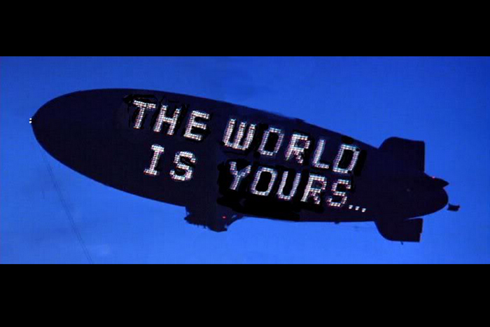 В една от сцените заедно с прелитащия дирижабъл пред очите на публиката преминава надписът The World IS Yours. Само глаголът се е променил…