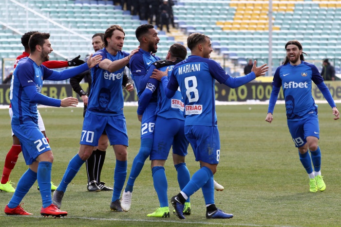 Първото полувреме вървеше равностойно и предимно с единоборства по целия терен. "Сините" владееха топката повече, но не стигаха до чисти голови ситуации. Пред символичните гости се откриха прилични възможности, при които завършващият удар винаги беше на Али Соу. В два от случаите - от малък ъгъл. В третия той имаше добър шанс, но стреля в аут от границата на наказателното поле.