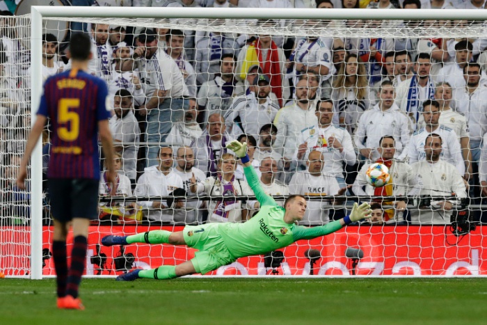 В края на полувремето "белите" можеха да поведат. Първо 18-годишният Винисиус бе изведен от Каземиро сам срещу Тер Стеген, но се забави и беше блокиран. Все пак той подаде на Карим Бензема, но стражът спаси удара на французина от упор.