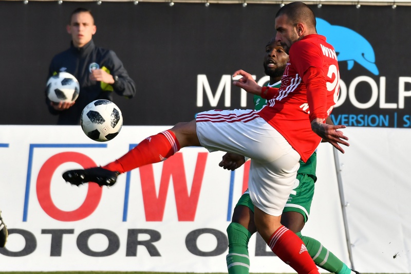В 30-ата минута гостите поведоха и това бе логично (горе). Изчистена топка стигна до Рубен Пинто и с удар от около 22-23 метра халфът порази Ренан в долния ляв ъгъл на стража - 1:0.