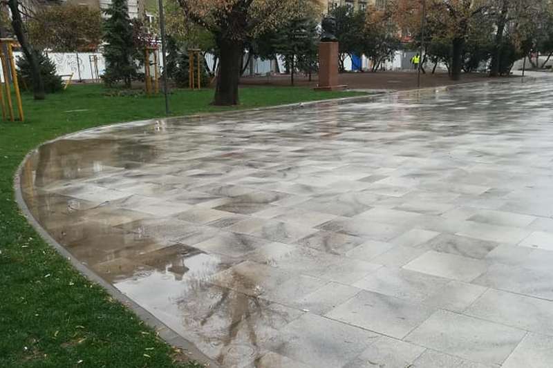 Междувременно с падналия тази нощ и подължил и през деня дъжд, социалните мрежи бяха заляти със снимки на образувани локви по новия паваж на "Графа" и в градинката пред църквата "Св. Седмочисленици".