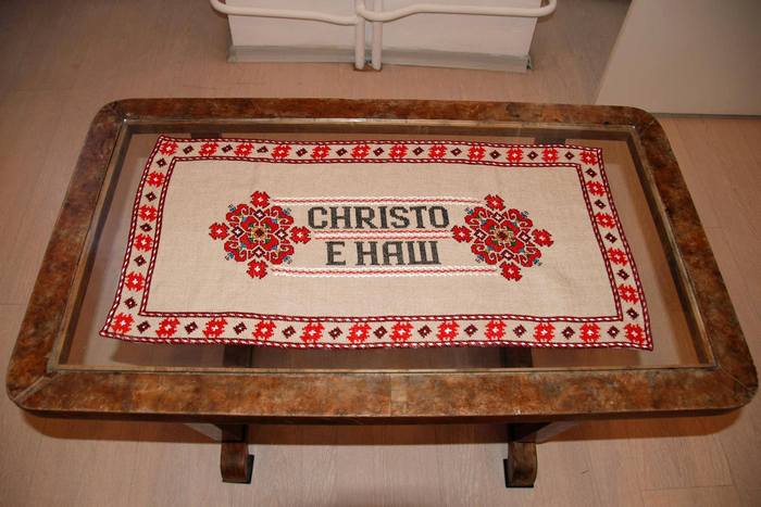 Друго произведение на Алла Георгиева в тази област е покривка, избродирана по краищата с най-грозния соц вариант на българската шевица, а в средата ѝ с черен конец е написано CHRISTO Е НАШ.