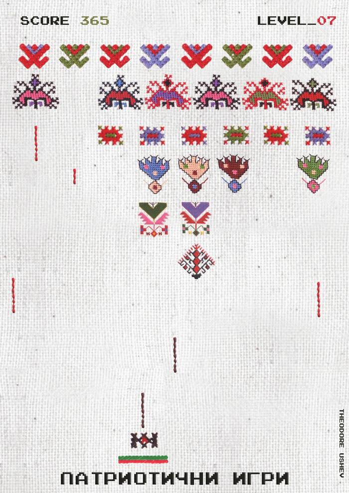 Много по-различна и оригинална в случая е работата на Теодор Ушев „Патриотични игри”. В нея геометрични форми от фолклора са се „строили” като елементи от компютърна игра, които се пренареждат в красиви конфигурации. Ушев не се е фиксирал върху пошлото, тъкмо обратното – работата е елегантна и лека, шевиците са разнообразни, пъстри и в ритмична връзка. Но патриотичната игра всъщност ги изличава една по една. Истинският артист може да бъде критичен без да унищожава чувството ни за изкуство или фолклор.