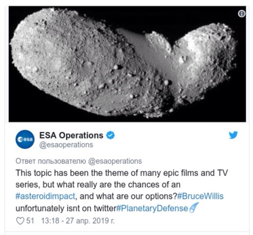„Тази тема е в основата на сценария на няколко холивудски блокбъстъра и тв филми. Но колко големи са шансовете за сблъсък с астероиди и какво можем да се направи? За съжаление, Брус Уилис не е в Туитър, за да ни отговори“, написаха от EКA в Туитър.