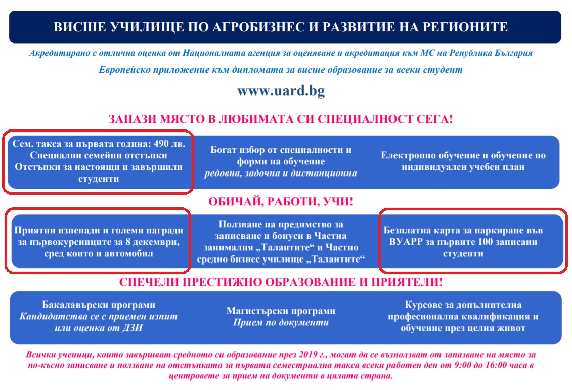 Може би „най-иновативни“ в тази област са ръководителите на Висше училище по агробизнес и развитие на регионите (ВУАРР), което е базирано в Пловдив и има филиали в Русе и Велико Търново. Докато най-престижните западни университети примамват най-големите таланти с именити преподаватели, условия за правенето на наука на световно ниво и възможности за трупане на практически опит в най-известните компании, международни институции и неправителствени организации, ВУАРР обещава на кандидатстудентите големи награди, включително автомобил, които се раздават с томбола на 8 декември. Първите 100 записали се получават и безплатна карта за паркиране в университета.