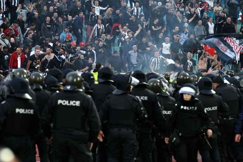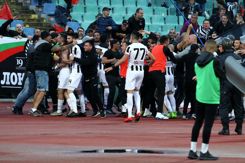 Сектор "Г", в който седяха феновете на Локо, подивя, десетки запалянковци слязоха на пистата и трябваше да се намесва полиция (на снимката долу). Мина без инциденти.
