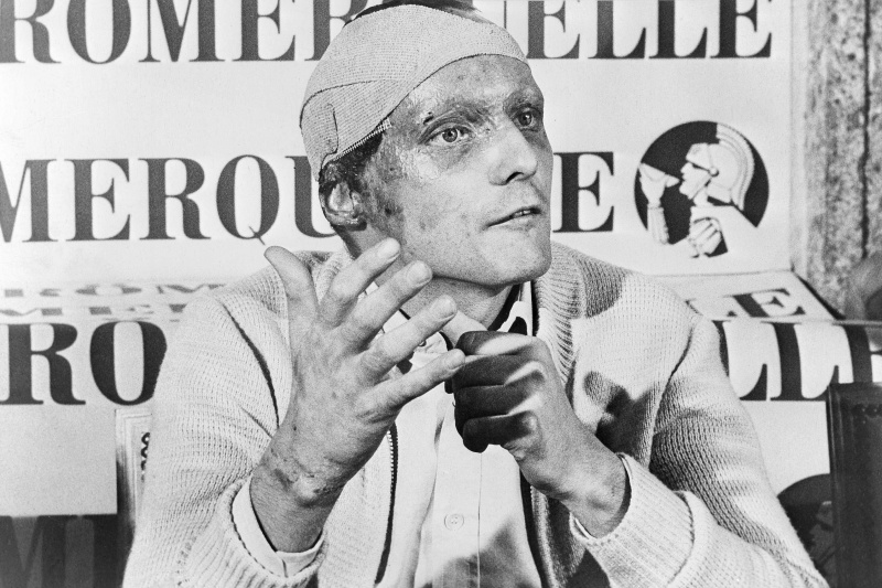 На втората обиколка болидът на шампиона излиза от пистата и се блъска в предпазна ограда. Избухва в пламъци. Трима състезатели спират, за да се притекат на помощ на своя опонент. Когато е изваден от кокпита, главата на аса гори. Изгарянията са от трета степен. Той губи косата си, част от дясното ухо, а пораженията по лицето са огромни.