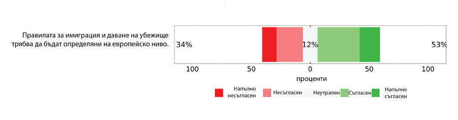 По-голяма диференциация е налице по темата за имиграцията. Потребителите са практически разделени на три големи групи – такива, които подкрепят ограничителната миграционна политика, такива които са изцяло срещу нея и по-умерена група, които застават по средата на скалата от 0 - 10. Същевременно 53 % от анкетираните предпочитат правилата за имиграция и даване на убежище да бъдат определяни на европейско ниво, въпреки че броят на онези, които подкрепят процеса на уеднаквяване на правилата в Брюксел, е далеч по-голям.