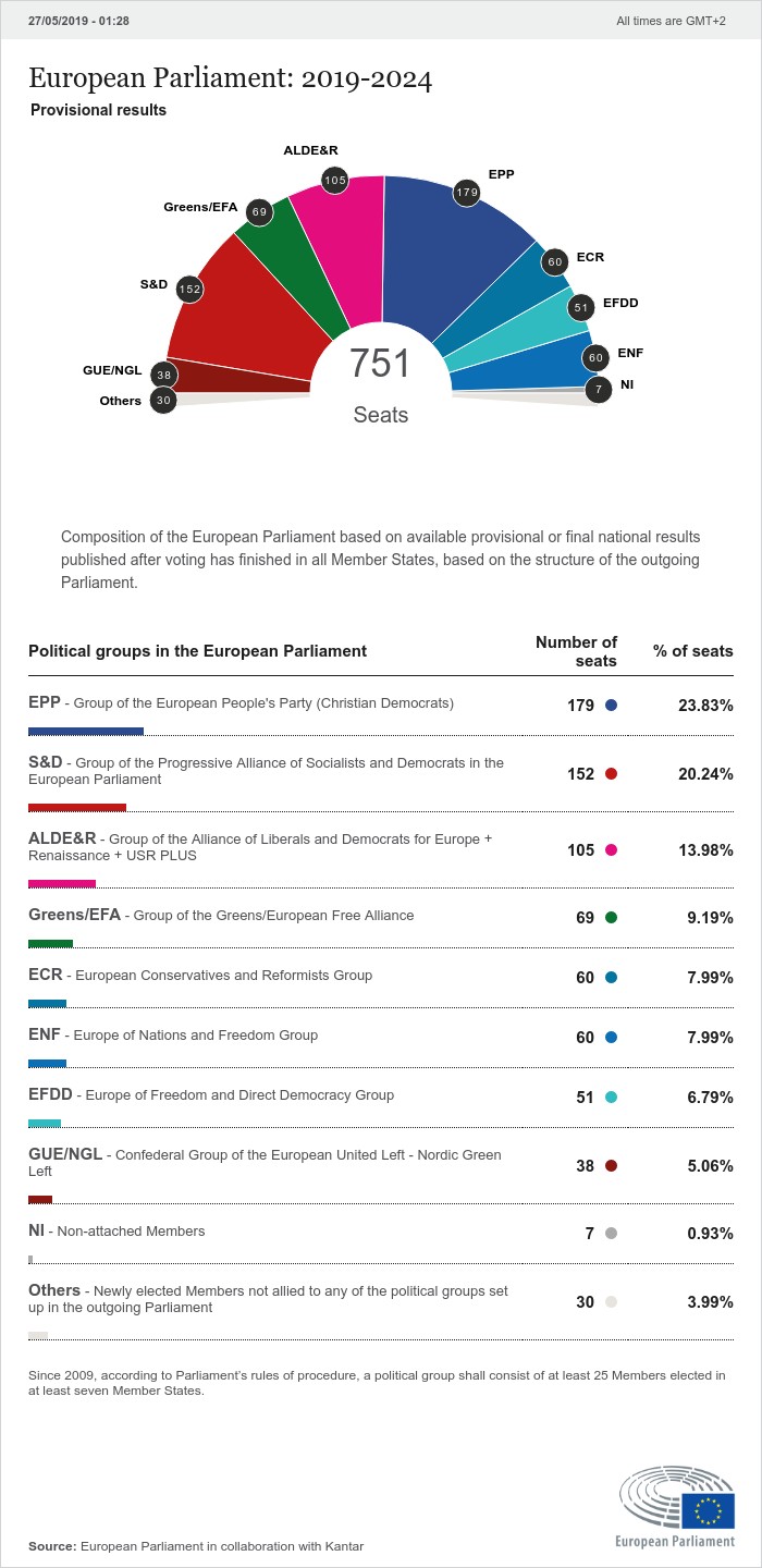 Крайнодесният алианс на Льо Пен и Салвини има засега 60 места при 37 досега, но е далече от прогнозираните от различните агенции от 74 до 86 места. След него са крайно евроскептичната Европа на свободата и пряката демокрация, групата на идеолога на Брекзит Найджъл Фараж с 51 места, крайната левица с 38 места, 7 независими депутати и 38 избраници от нови партии, които тепърва ще търсят своите групи в Европейския парламент.