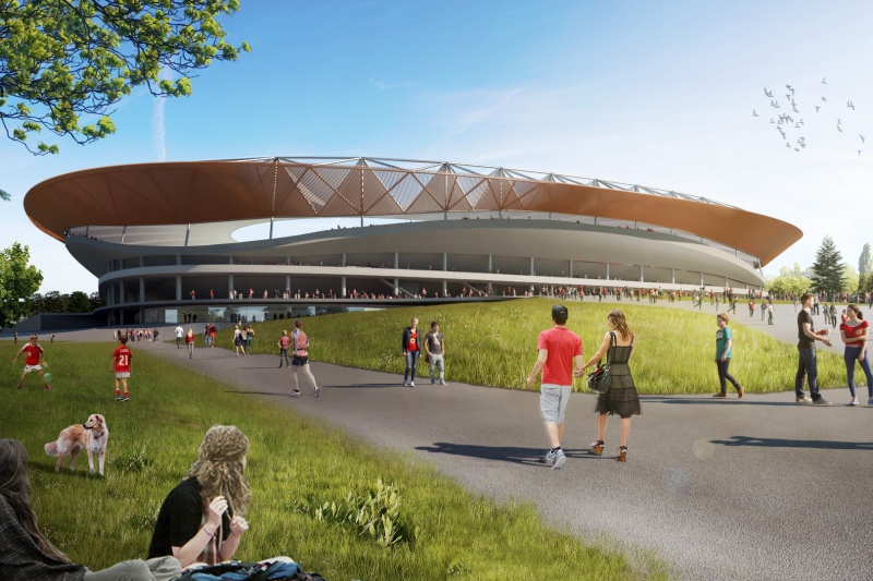На снимките е проектът на "DESET architects", който е за съоръжение с капацитет от близо 28 000 души. В него са намерени и решения за паркингите и прилежащата инфраструктура, която да не оказва влияние върху функционирането на алейната мрежа на парка."