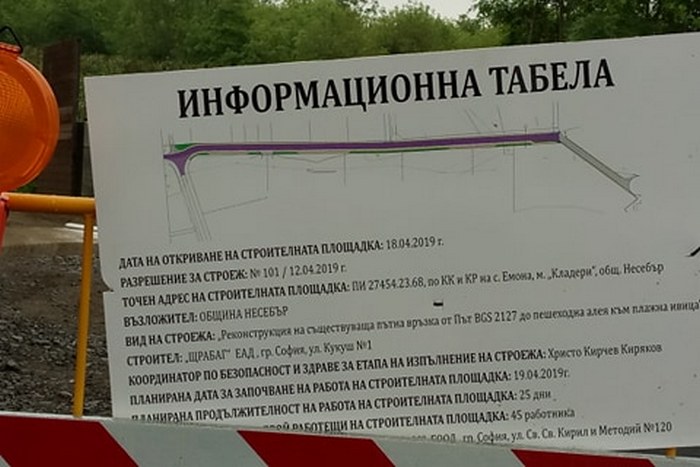 За да се стига от главния път до концесионирания плаж инвеститорите започнаха реконструкция на отбивката. Разрешението за строеж е издадено на 12 април тази година, показва справка в регистрите на Община Несебър. Дейностите започват седмица по-късно, а планираният срок за изпълнение е 25 дни - до средата на май. Те включват "изкоп и основа на пътя, горно строене, път с уширения за успоредно паркиране, бордюри с два обслужващи тротоара и асфалтова настилка на пътя."