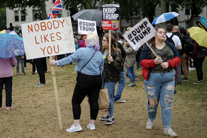 Той определи хилядите хора, които демонстрираха в Лондон срещу визитата му във Великобритания, като "малък протест". Тръмп заяви, че е видял само една малобройна демонстрация и определи медийните съобщения за по-масови протести като фалшиви новини.