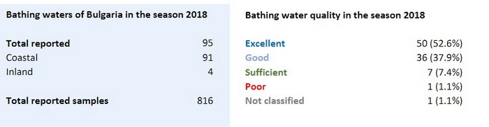 Взети са общо 816 проби от 95 места в България – 91 на сушата и 4 във вътрешността. В 50 от местата водата е с отлично качество. В 36 места, или 37,9 на сто, качеството е добро. Като задоволително то е оценено в 7 места, или 7,4%. На по едно място (по 1,1%) водата е съответно лоша и невключена в класификация.