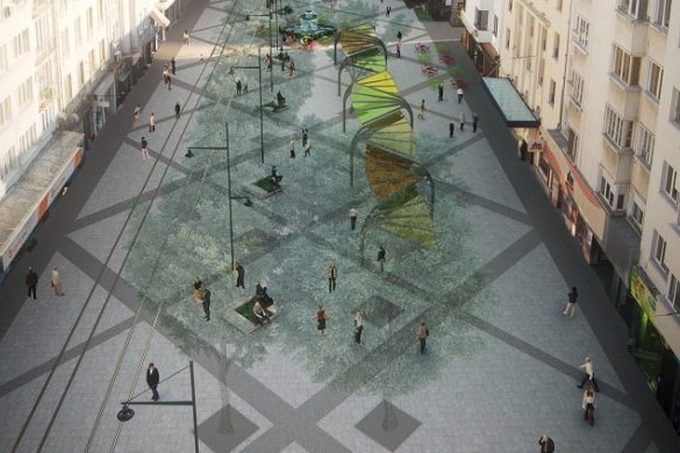 Огромните метални навеси са част от проекта на архитектурно студио А.Д.А. – идеята им бе да бъдат подслон за букинистите и тяхната стока на площада.
