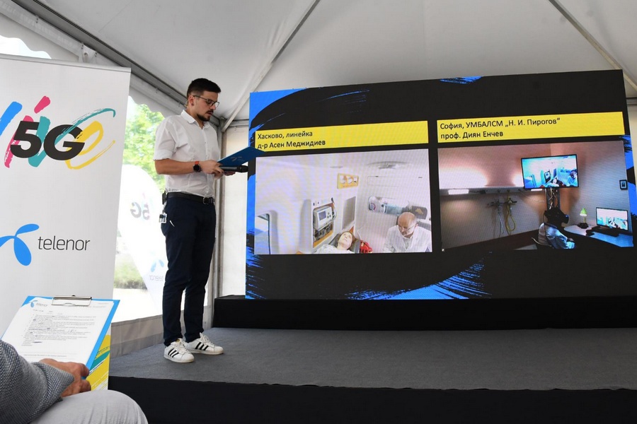 Вторият тест бе още по-впечатляващ и загатва за множеството възможности за обществена употреба на 5G връзка - медицинско диагностициране от разстояние на спешен случай. Прегледът се осъществява по връзка между централата на оператора в столицата, болница "Пирогов" и линейка в Хасково. Той включва 360-градусова камера и очила за виртуална реалност, които позволяват специалист да е "на място".