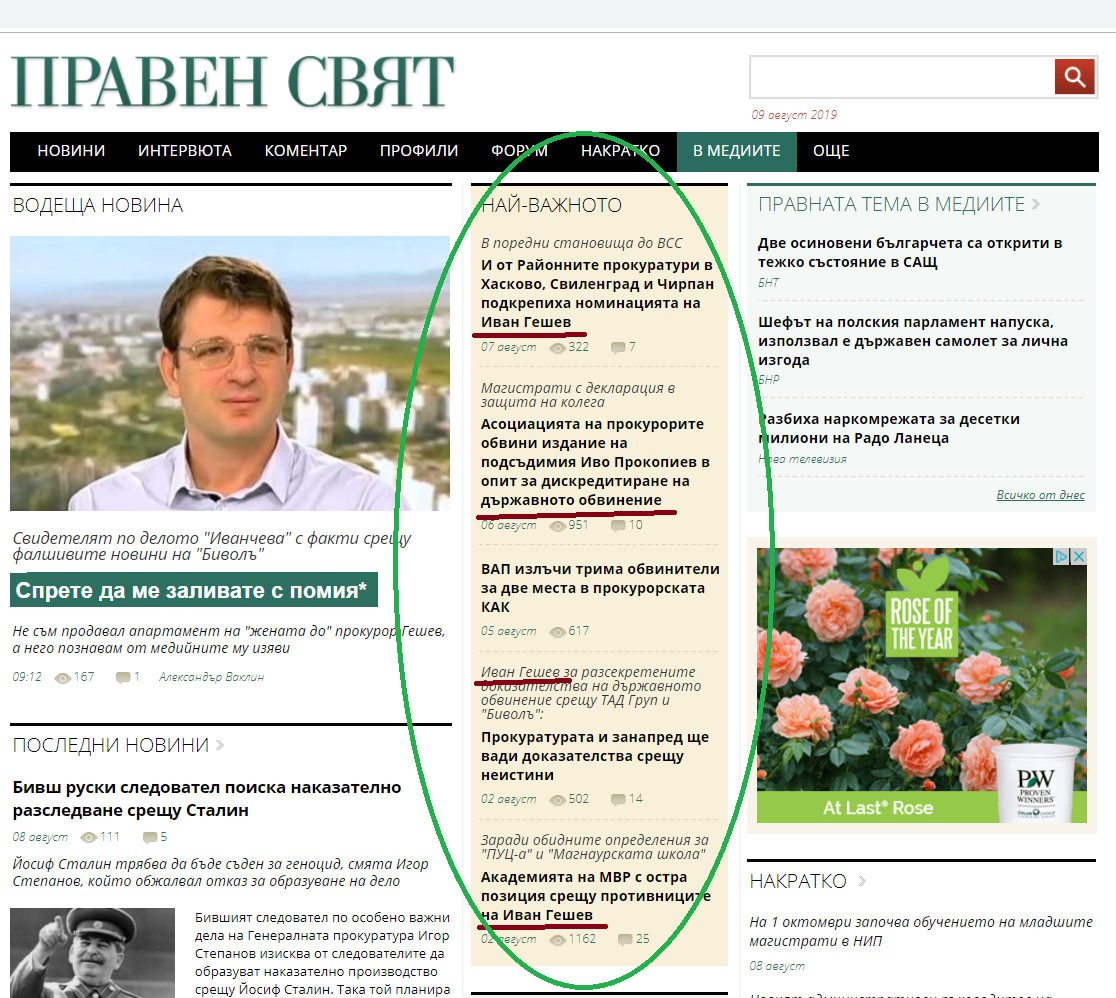 В рубриката "Най-важното" от 5 новини в 3 фигурира името на Иван Гешев. Включително и онази трогателна и напълно безпрецедентна позиция по негов адрес на Академията на МВР отпреди няколко дни - как давали брилянтно правно образование... А четвъртата новина само проформа не съдържа Името в заглавие, но е в негова защита - срещу "подсъдимия Иво Прокопиев", който дискредитирал държавното обвинение - ясно в чие лице. Нищо, че това кой да е подсъдим, е монопол именно на същата тази прокуратура.