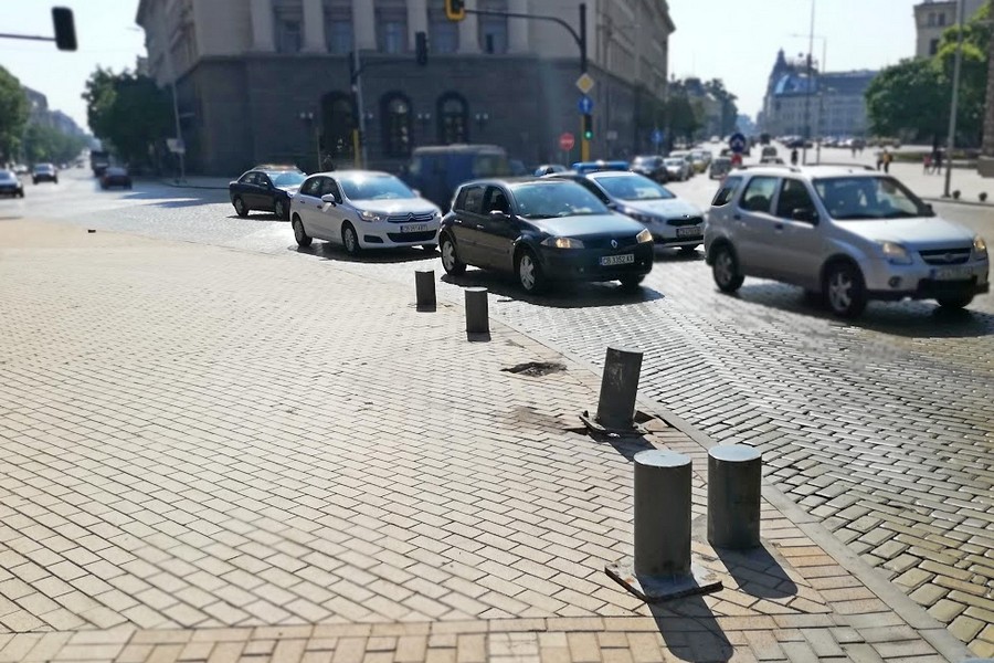 Освен плочките, са пострадали и изключително здравите колчета, които са на ръба с платното на пл. "Независимост".