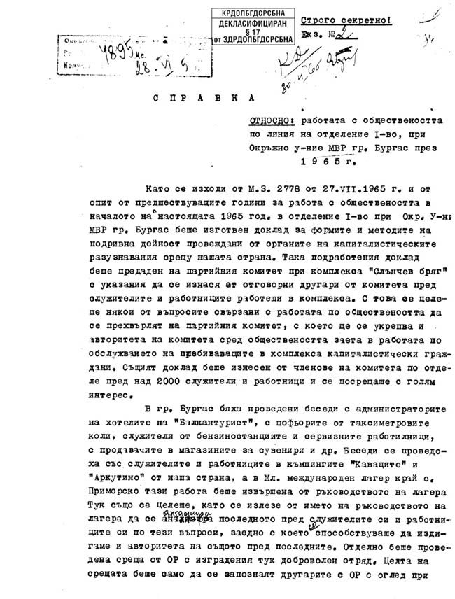 Той представлява строго секретна справка относно: "Работата с обществеността по линия на отделени I-во при Окръжно управление на МВР Бургас през 1965 г."