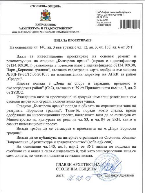 Съобщението бе тиражирано малко, след като главният архитект на София Здравко Здравков издаде желаната от ЦСКА-София виза за инвестиционно проектиране на основен ремонт на стадион "Българска армия".