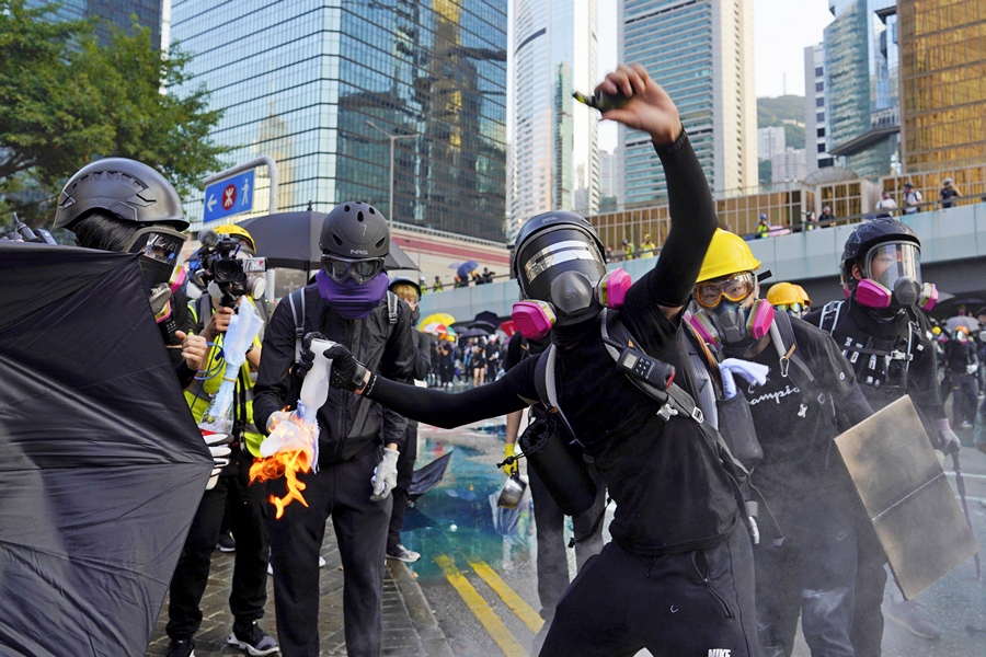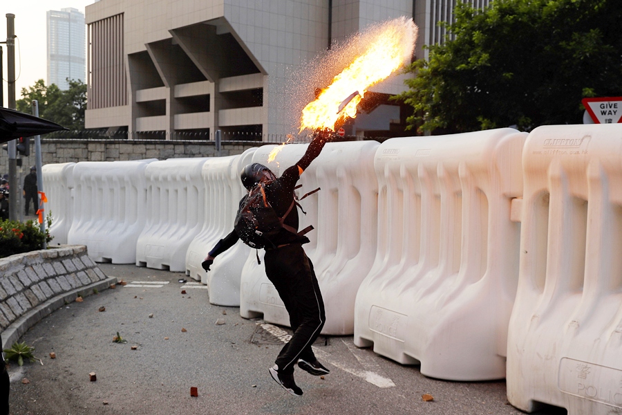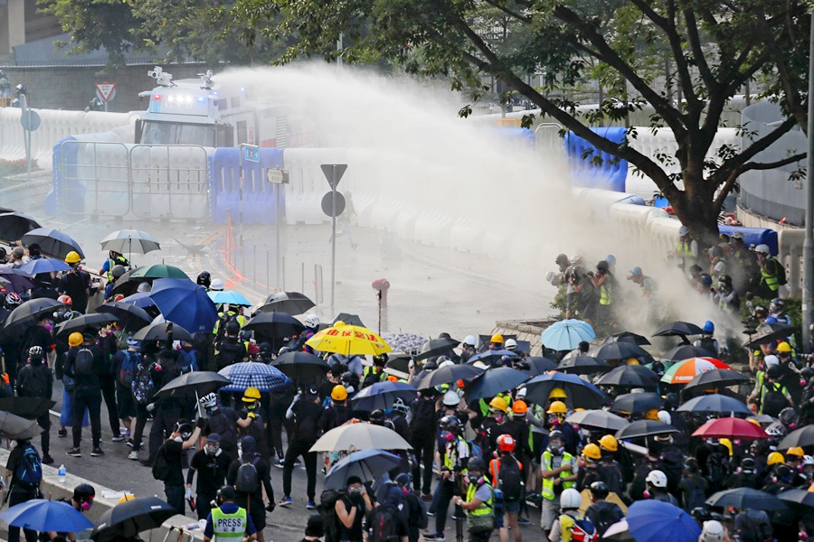 Протестиращите, облечени в черно, се сблъскаха с облечени в бяло жители на Фортрес Хил и Норт Пойнт - два квартала, често свързвани с триадите и с неотдавна пристигнали мигранти от континентален Китай. Полицейското присъствие в града е засилено, водни оръдия и части на полицейските сили за борба с безредиците ги следват отблизо.