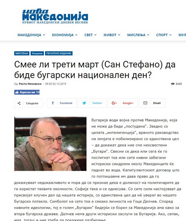 Избирането на 3 март за национален ден на страната е дълбоко провокативно за всички съседни страни, особено Македония. Това открито символизира техните стремежи за анексия към части от няколко държави. Няма никакво основание или оправдание, нещо, което е предварително и което не влезе в сила, за използва от София национален празник. Въпросът трябва да бъде повдигнат при преговорите по исторически въпроси между двете страни", разсъждава Ристо Никовски.