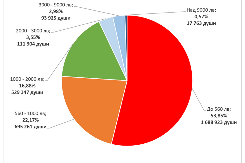 Близо 1,7 млн. души, което е над половината или 53,85% от всички, декларират месечни доходи равни на или по-ниски от минималната работна заплата. Нещо повече – групата на най-бедните се увеличава, макар и малко, тъй като през 2017 г. доходи до МРЗ (510 лв.) са получавали 53,4% от всички.