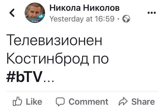 Това заяви пред Клуб Z пиарът на партията Никола Николов, който още вчера няколко часа преди приключването на гласуването, обяви в профила си във фейсбук: "Телевизионен Костинброд по бТВ", очевидно визирайки т.нар. Костинбродска афера.